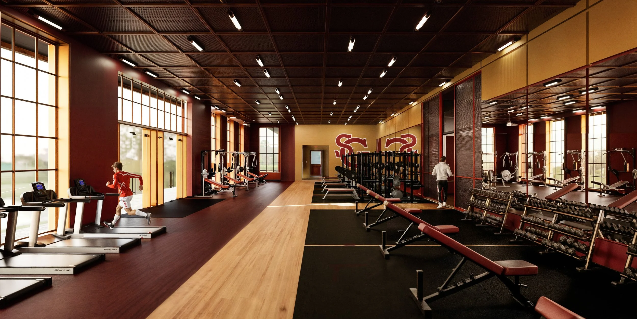 The ground floor program includes a 40-yard indoor turf field, weight room, boys’ and girls’ locker rooms, a dedicated football locker room, and a medical office. The second level houses an event space, restrooms, coaches’ offices, and conference rooms, allowing the facility to function beyond daily training as a venue for gatherings, meetings, and school events.